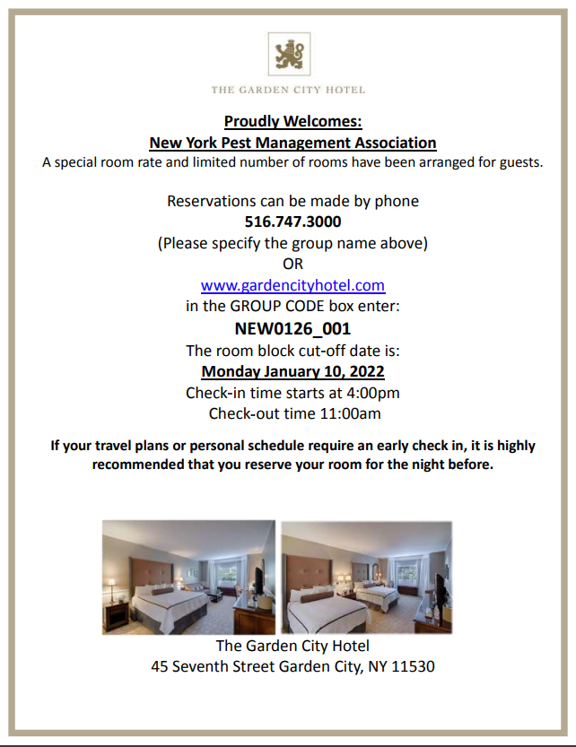 For your convenience NYPMA has booked a block of rooms at the Garden City Hotel. You can reserve your rooms by calling direct: 516.747.3000 and mention New York Pest Management Association (rooms) to receive the group rate of $199/night. Make sure to book your room by January 10th. Reservations made after January 10th will be subject to availability